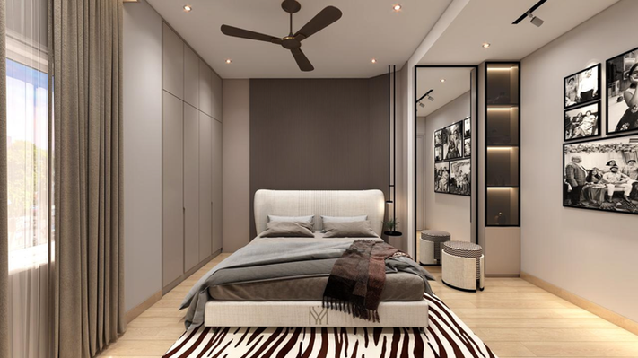 masterbedroom The master bedroom is a relaxing oasis, boasting a calming color scheme, plush textiles, and elegant fluting on the bed's back panel with soft edges, creating a serene ambiance.
